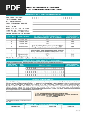 Kami memberikan peluang yang saksama untuk memperoleh masa depan kewangan yang lebih baik dan menguntungkan. Up to 48 months repayment period. Bsn Balance Transfer Application Form 151117 - Free download as PDF File pdf Text File txt or read online for free.
