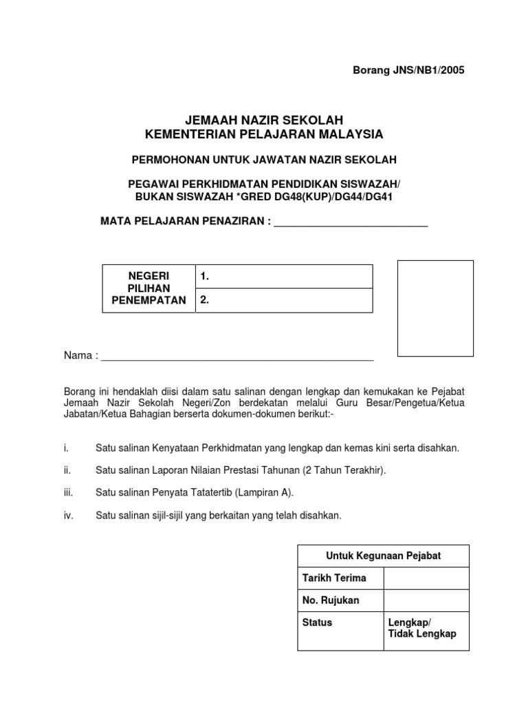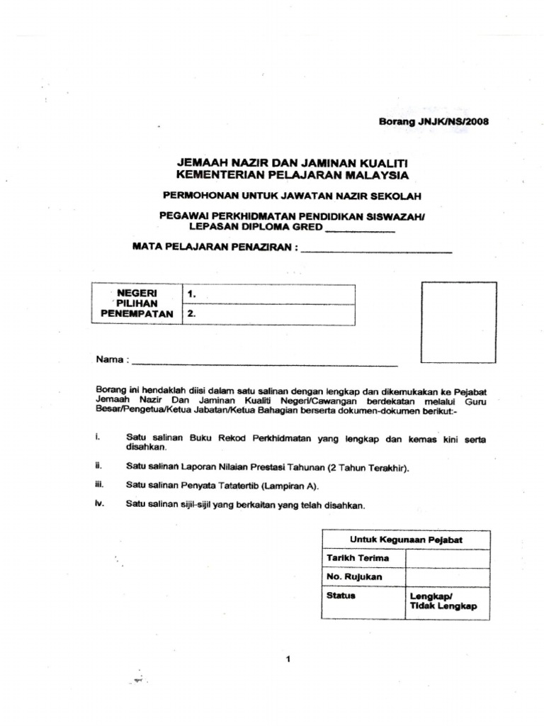 Borang permohonan jawatan nazir sekolah. Borang permohonan yang sempurna diisi hendaklah disertakan sekeping gambar warna terkini berukuran pasport salinan sijil lahir salinan kad pengenalan salinan sijil berhenti sekolah salinan sijilkelulusan akademik dan dokumen lain yang berkaitan dan hendaklah disahkan. BORANG PERMOHONAN JAWATAN KOSONG gambar kelayakan daripada JPA atau LAN. 03-8737 7899 FAX.