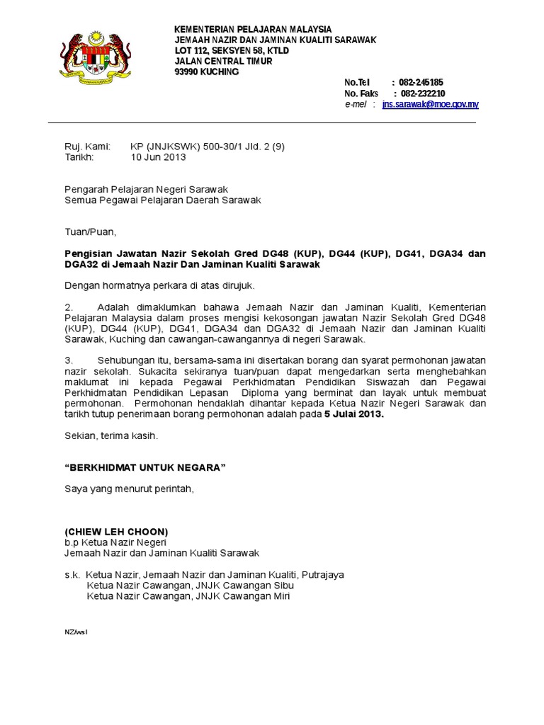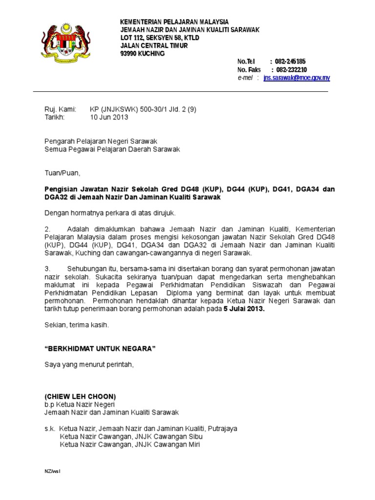 Borang ini boleh didapati dengan percuma dari Pejabat Suruhanjaya Perkhidmatan Awam. 23102019 lampiran b borang permohonan untuk jawatan nazir sekolah LAMPIRAN A IKLAN KEKOSONGAN JAWATAN PENOLONG PENGARAH NAZIR SEKOLAH JEMAAH NAZIR KEMENTERIAN PENDID1KAN MALAYSIA Pegawai Perkhidmatan Pendidikan PPP yang berkelayakan adalah dipelawa untuk mengisi kekosongan jawatan gred DG44 dan DG48 di Jemaah Nazir. 2 Persiaran Masjid Bukit SUK Seksyen 5 40676 SHAH ALAM 5.