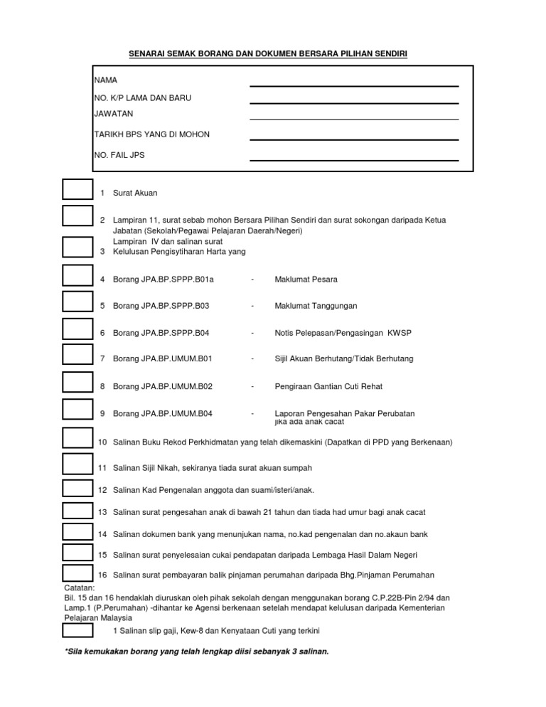 MAKLUMAT KHUSUS DALAM BORANG TERTENTU. BORANG JPABPSPPPB01a MAKLUMAT PESARA. 21 Permohonan Persaraan Pilihan Sendiri hendaklah sampai ke JABATAN PENDIDIKAN NEGERI JOHOR untuk perhatian UNIT PENCEN tidak lewat 10 bulan dari tarikh persaraan pilihan yang dicadangkan.