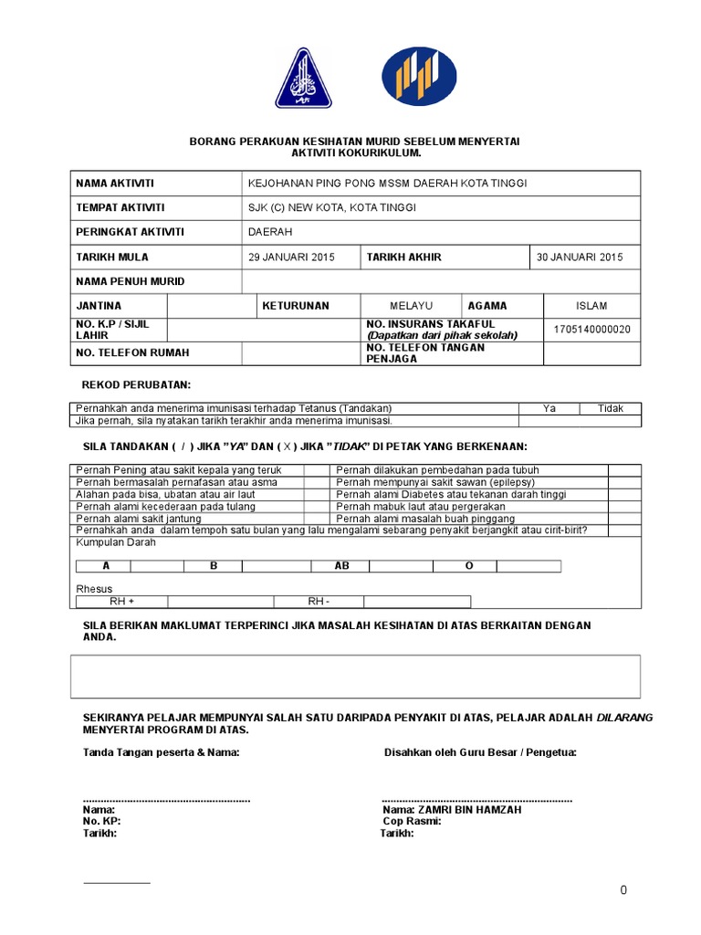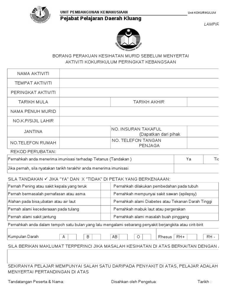Borang Rekod Peribadi Dan Maklumat Kesihatan Murid