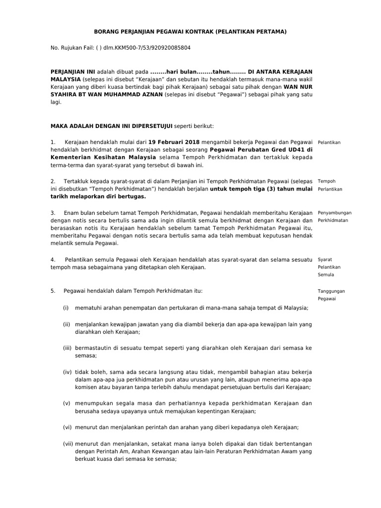 05062020 PP 22008 Pelantikan seseorang calon atau pegawai untuk berkhidmat dengan agensi awam yang diuruskan mengikut PP ini bagi tempoh tertentu berasaskan kepada syarat perkhidmatan seperti yang dipersetujui dalam perjanjian kontrak yang ditandatangani oleh calon atau pegawai dengan Pihak Berkuasa Melantik Senarai Semak Peraturan-Peraturan Pegawai. SURAT PERJANJIAN KERJA PEGAWAI KONTRAK. Salinan Surat Pembatalan Pas Kerja bagi pekerja gantian 5.