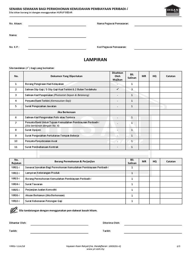Isi dan tandatangan borang permohonan menggunakan pen dakwat basah hitam TIDAK boleh menggunakan ball pen Jangan tulis tarikh pada semua borang. YIR01-i 0820 Yayasan Ihsan Rakyat No. Yayasan Ihsan Rakyat YIR adalah syarikat berdaftar di Malaysia dan beroperasi sejak tahun 2012.