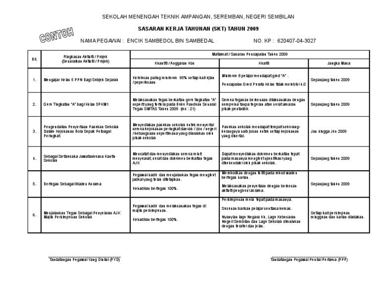By Chong Jia Chen. Contoh Sasaran Kerja Tahunan Skt 2015. I Kembaran I SASARAN KERJA TAHUNAN PERINGATAN Pegawai Yang Dinilai PYD dan Pegawai Penilai Pertama PPP hendaklah memberi perhatian kepada perkara-perkara berikut sebelum dan semasa melengkapkan borang ini.
