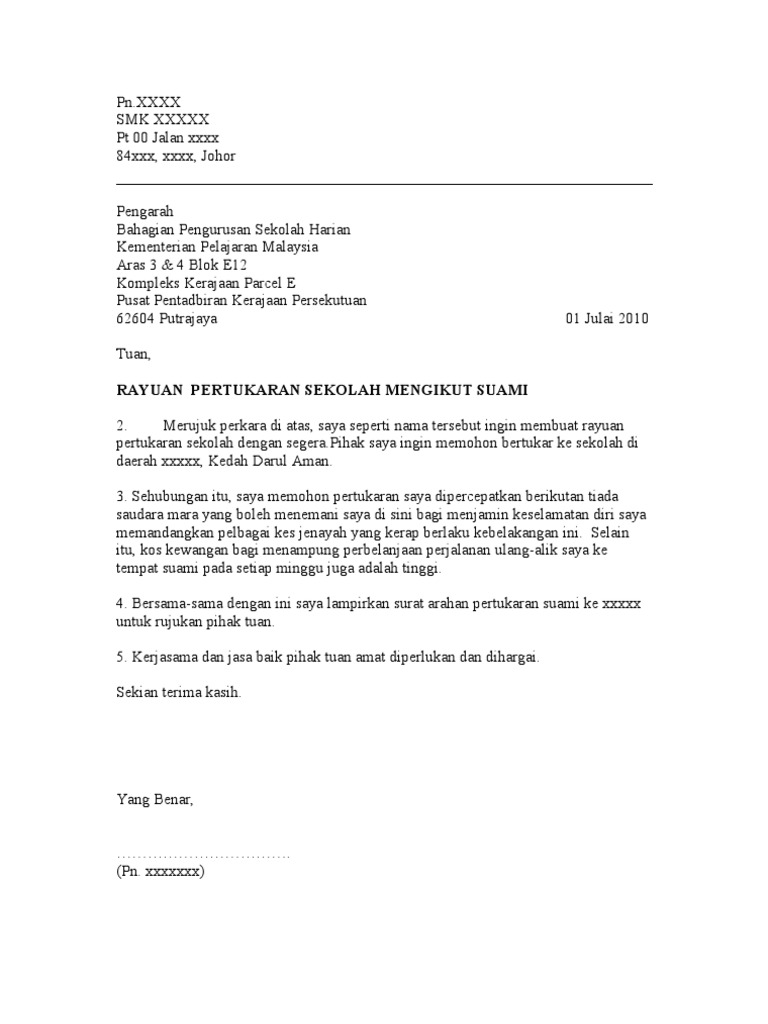 Contoh Surat Rayuan An Pertukaran Mengikut Suami
