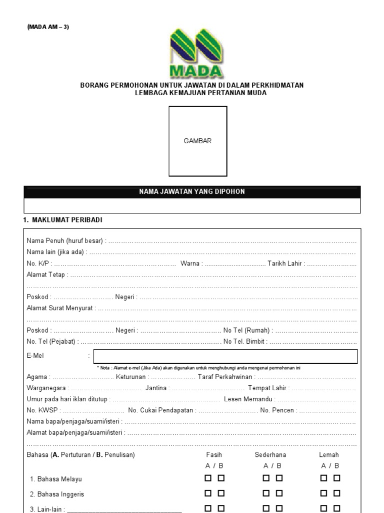 Borang jawatan kosong mada. Dalam ekonomi hari ini ramai orang hampir ke tahap terdesak untuk mencari pekerjaan Jawatan Kosong Kerajaan Terkini 2019 dan apabila tawaran pekerjaan iklan kerja kosong yang menjanjikan seolah-olah muncul dalam. Garis Panduan Pelaksaan Program. Pemohon daripada warganegara Malaysia yang berminat dan memenuhi kriteria yang telah ditetapkan dijemput untuk memohon jawatan kosong di Lembaga Kemajuan Pertanian Muda MADA sebagai.
